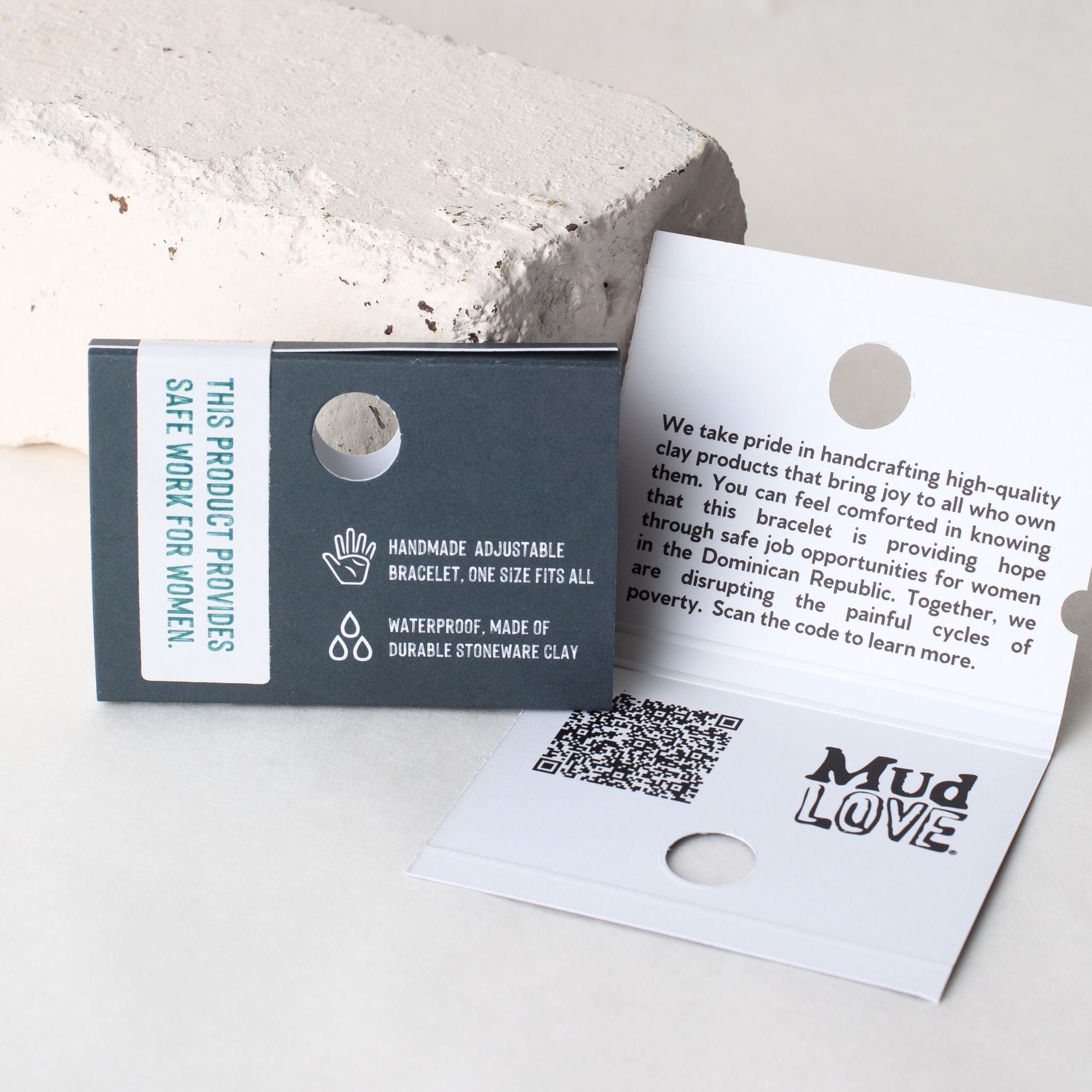 Created with extruded clay tubes with a white glossy glaze finish and permanently printed word. The clay piece is finished on a durable, smooth-sliding stretch cord for easy adjustability.